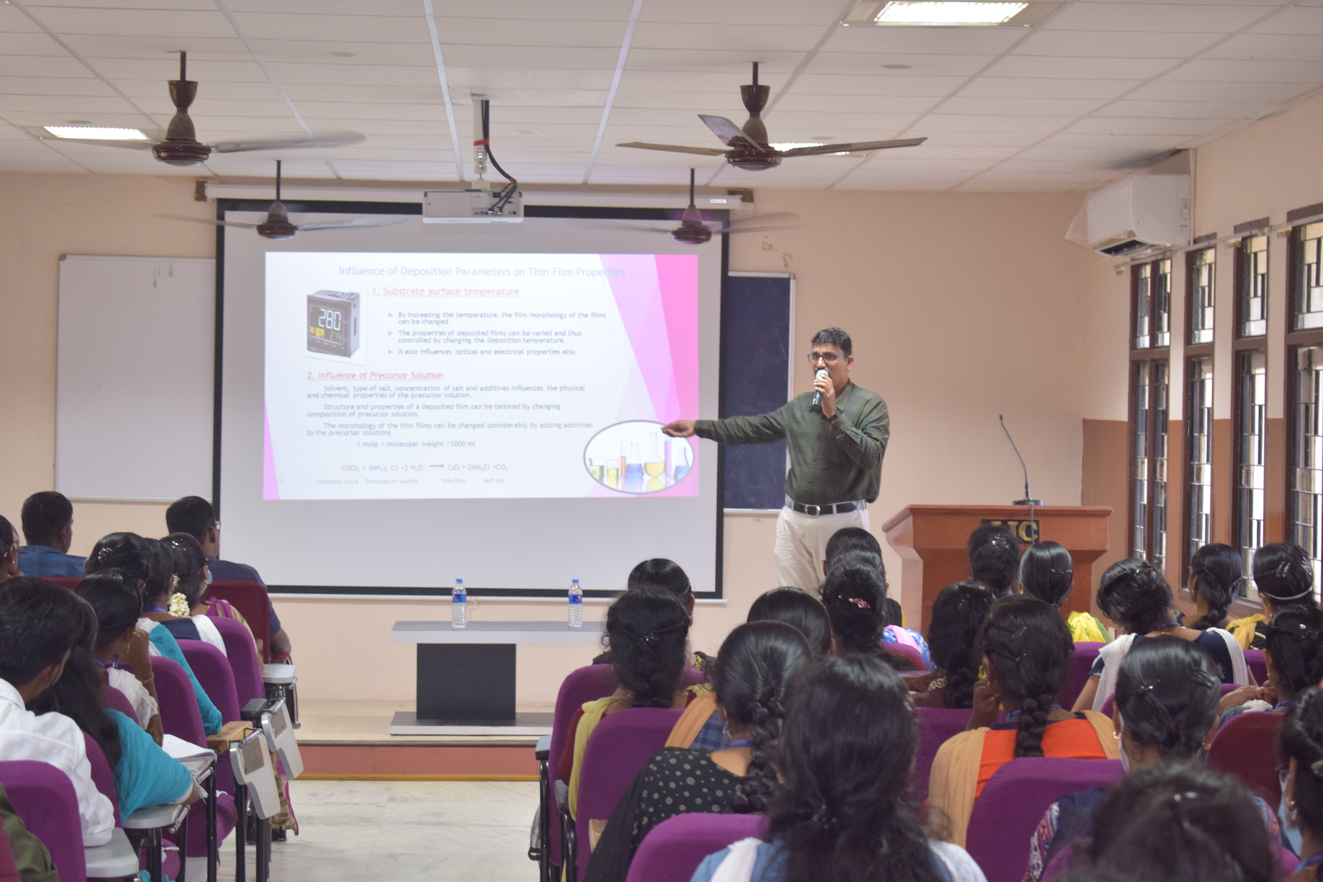 The resistivity of all the samples decreased with increase in substrate temperature. A maximum carrier concentration value of 7.36 9 1018 cm-3 was obtained for the film grown at substrate temperature of 300 °C. The carrier mobility was increased up to 86.2 cm2/Vs by increasing the substrate temperature from 200 to 300 °C and then it decreased to 17.6 cm2/Vs at a substrate temperature of 350 °C. Dr. K. Dhanabalan, Assistant Professor of Physics, presided over the meeting. R.Sri Vaishnavi and R. Ragi Krishna, I M.Sc. Physics welcomed the gathering and M.K. Hima I M.Sc. Physics proposed the vote of thanks.