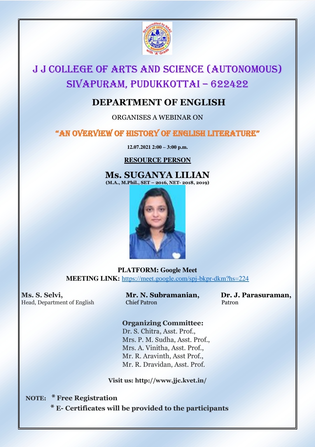 The Department of English JJ College of Arts and Science (Autonomous) Sivapuram Pudukkottai organised webinar - Lecture An overview of History of English Literature on Monday 12th July 2021.