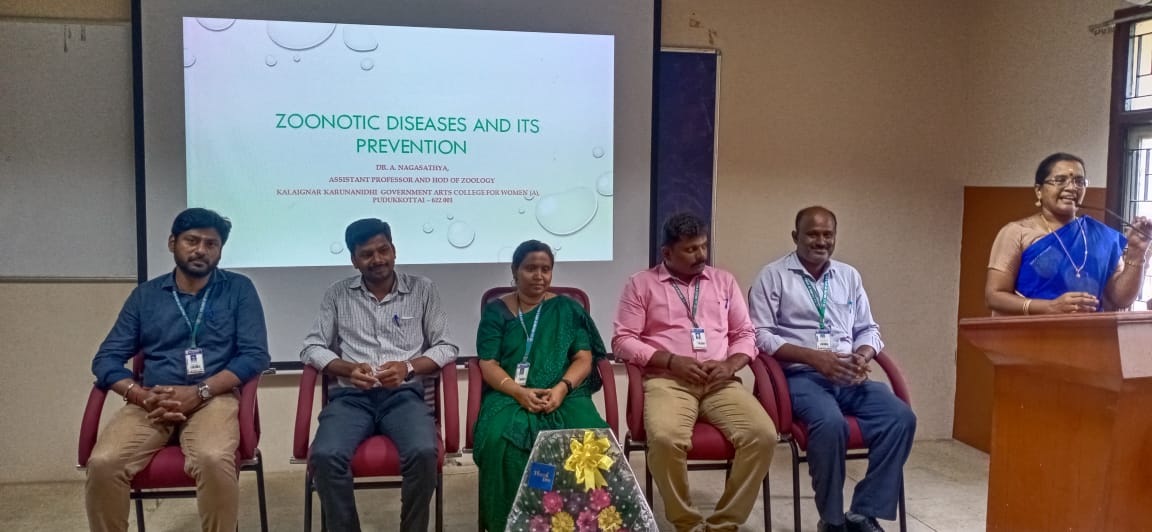 The talk was given by Dr. A. Nagasathya, Assistant Professor and Head, Dept. of Zoology, Govt. Arts and Science College for Women, Pudukkottai in which she emphasized that the global COVID-19 pandemic has been a harsh reminder of the age-old threat posed by zoonoses or zoonotic diseases, infectious diseases transmitted from animals to humans. Sixty percent of human pathogens come from animals, while 75% of new, emerging and re-emerging diseases are zoonotic. Globally, it is estimated that every year, around 2.6 billion people suffer from zoonotic illnesses and around 2.7 million succumb to these.