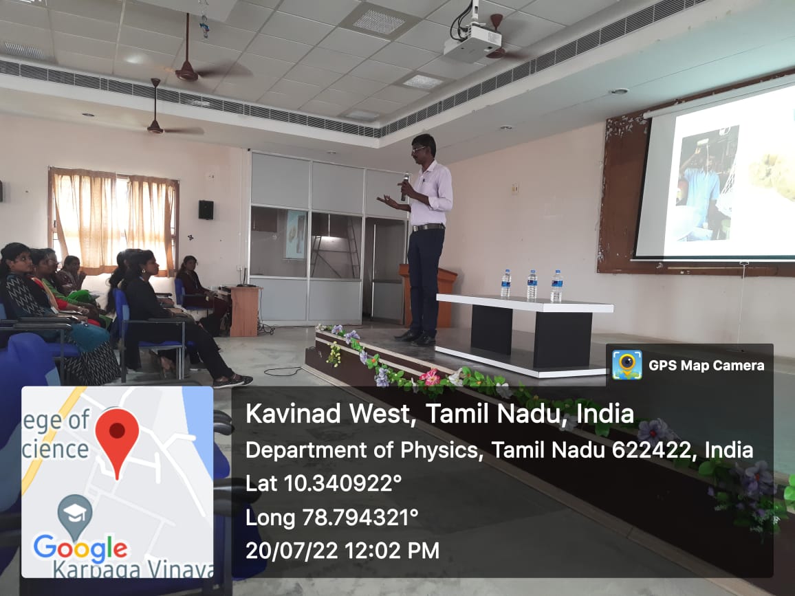 The Department of Physics, J.J. College of Arts and Science (Autonomous), Pudukkottai arranged a special lecture programme on Wednesday 20.07.2022. Dr. M. Kumaresavanji Assistant Professor and Principal Investigator, Nanomaterials Laboratory, Department of Physics, National College (Autonomous), Tiruchirappalli, TN.