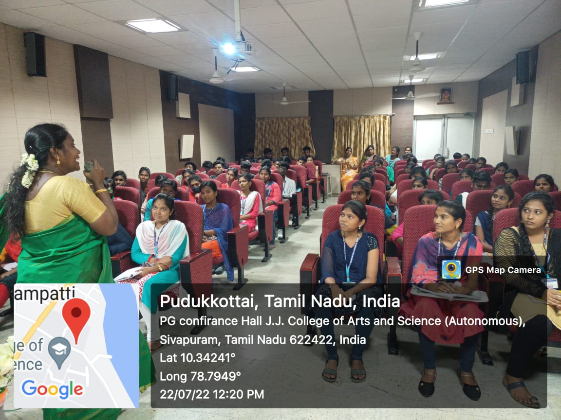 புதுக்கோட்டை ஜெ.ஜெ. கலை அறிவியல் கல்லூரி (தன்னாட்சி), நுண்ணுயிரியல் துறையின் ஜென்னர் கிளப் சார்பாக சிறப்பு விரிவுரை நடைபெற்றது. விரிவுரைக்கு கிராம நிர்வாக அலுவலர் A.ஈடித் ரேனா அவர்கள் கலந்து கொண்டு மாணாக்கர்களுக்கு “போட்டித் தேர்வுக்கான தயாரிப்பு ஒத்தி” என்ற தலைப்பில் கருத்துரை வழங்கினார். முன்னாள் குடியரசுத் தலைவர் A.P.J. அப்துல் கலாம் ஐயா அவர்கள் கூறியப்படி “கனவு காணுங்கள்” – அதே கனவு மெய்ப்பட வேண்டுமென்றால் “உலகின் மிக அழகிய சொல், செயல்” ஆகவே ஸ்மார்ட் ஆக செயல்பட வேண்டும் என்று தன் உரையைத் தொடங்கினார்.