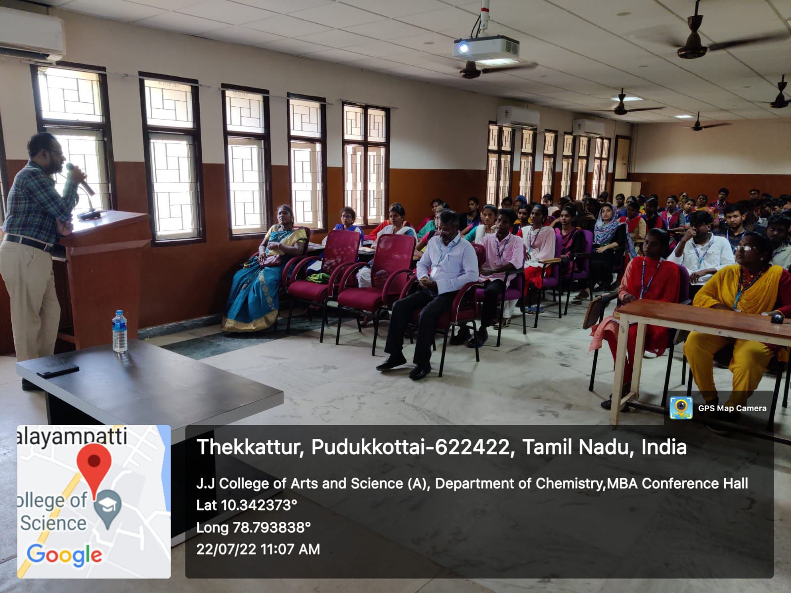 புதுக்கோட்டை ஜெ.ஜெ. கலை அறிவியல் கல்லூரி (தன்னாட்சி), வேதியியல் துறை, ரெசனான்ஸ் சங்கம் சார்பில் 22.07.2022 அன்று புறப்பரப்பு வேதியியல் என்னும் தலைப்பில் சிறப்பு விரிவுரை நடைபெற்றது. இதில் முனைவர் A.ஜாபர் அகமது, இணைப்பேராசிரியர், வேதியியல் துறை, ஜமால் முகமது கல்லூரி, திருச்சிராப்பள்ளி சிறப்பு விரிவுரையாளராக பங்கேற்றார்.