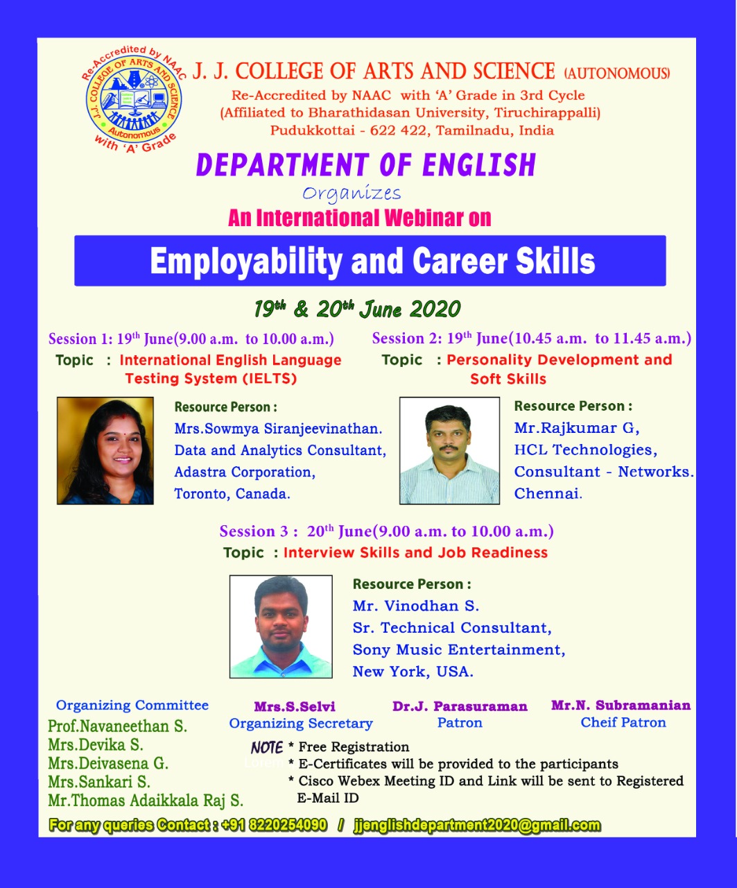 The PG and Research Department of English, JJ College of Arts and Science (Autonomous), Sivapuram, Pudukkottai conducted an International webinar on ‘Employability and Career Skills’ on 19th and 20th June 2020.