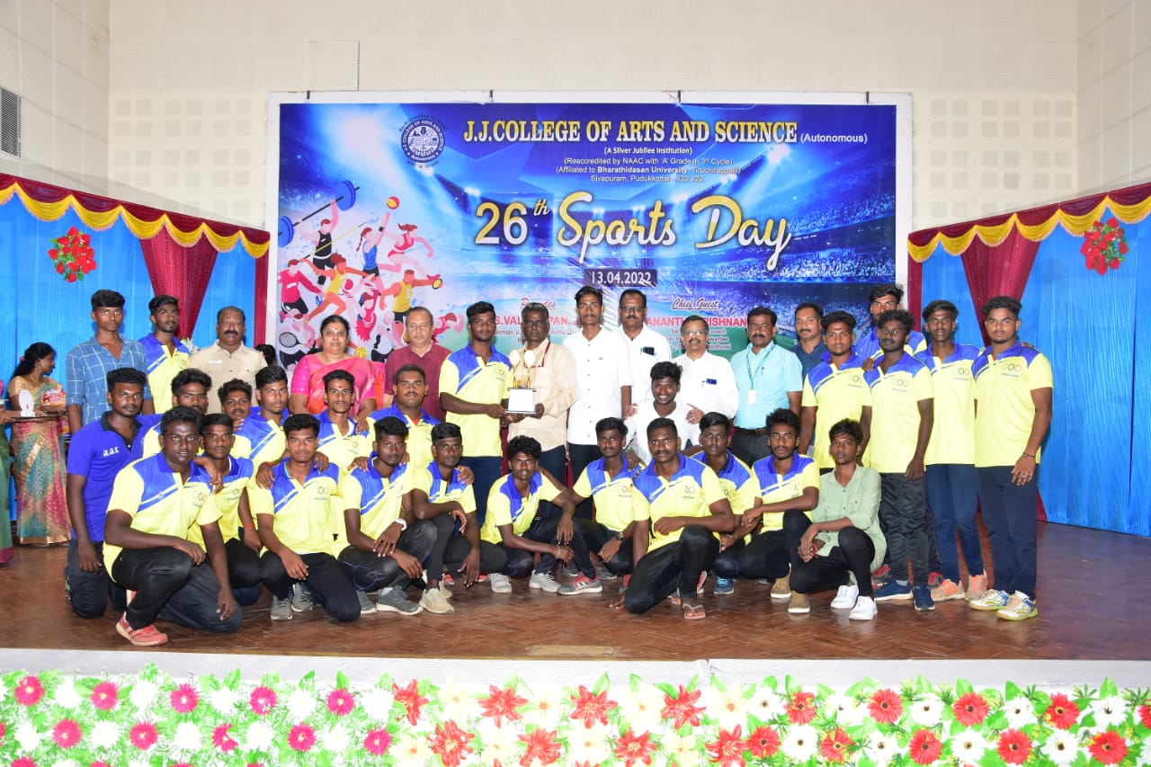 புதுக்கோட்டை ஜெ.ஜெ.கலை அறிவியல் கல்லூரியின் (தன்னாட்சி) 26-ஆவது விளையாட்டு விழா 13.04.2022 அன்று நடைபெற்றது. விழாவிற்கு SAI சிறப்புப் பயிற்றுநர் விருது பெற்ற கபடி பயிற்றுநர் முனைவர் R.ஆனந்த கிருஷ்ணன் சிறப்பு விருந்தினராக கலந்து கொண்டு, விளையாட்டுப் போட்டிகளில் வெற்றி பெற்ற மாணாக்கர்களுக்குப் பரிசுகள் வழங்கி பாராட்டிப் பேசினார். அவர் தம் உரையில் மனிதனுக்கு மானமும் அறிவும் அவசியம். அந்த அறிவைப் பெற வேண்டுமானால் உடல்நலம், மனநலம், உயிர்நலம் ஆகிய மூன்றும் ஒருங்கிணைந்த பலம் பெற்று இருக்க வேண்டும். இந்த மூன்றும் அமைந்தால் மட்டுமே நற்சிந்தனையும் நற்செயலும் உருவாக இயலும். அதன் தொடர்ச்சியாகவே நாம் எந்தக் கல்வியையும் பெற முடியும். எனவே, விளையாட்டு என்பது உடற்கல்வித் துறையைச் சார்ந்த மாணாக்கர்களுக்கு மட்டுமன்று, எந்தத் துறையில் பயிலும் மாணவர்களுக்கும் விளையாட்டு அவசியமான தொன்றாகும். விளையாட்டு, போட்டி நிலையில் நடத்தப்பெற்றாலும், பரிசு பெறுதல் அதன் இலக்காக இருந்தாலும், அடிப்படையில் மனதை மகிழ்ச்சியாக வைத்துக் கொள்வதற்கே நடத்தப்பெறும் ஒன்றாகும். மகிழ்ச்சியையும் அற வழியிலேயே அடைவது அவசியம் என்று உணர்ந்தே மாணவர்கள் உருவாக்கப் படுகிறார்கள். இன்றைய நிலையில் ‘உடல்பருமன்’ என்கிற பிரச்சனை மனிதச் சமுதாயத்தை அச்சுறுத்தக் கூடிய ஒன்றாக இருந்து வருகிறது. ஆனால், ஜெ.ஜெ. கலை அறிவியல் கல்லூரியில் எவரைப் பார்க்கிலும் அப்பிரச்சனையைக் காண இயலவில்லை. அது இக்கல்லூரியும் கல்லூரியின் விளையாட்டுத்துறையும் மாணாக்கர்களுக்கு விளையாட்டுக்கான வாய்ப்புகளை எந்தளவிற்கு வழங்குகிறது என்பது தெரிகிறது. பாரதியார் காற்று எனும் வசன கவிதையில் உடல்நலம் போற்ற உறுதியடைந்த மனமும் வேண்டும் என்று கூறுகிறார். எனவே, நீங்கள் உங்களைச் சிறப்பாக உருவாக்கிக் கொள்வதன் மூலம் நல்ல வலிமையான மனித சமுதாயம் உருவாகிட உதவிட வேண்டும் என்று மாணாக்கர்களையும் பாராட்டிப் பேசினார். முன்னதாக, உடற்கல்வித் துறைத்தலைவர் முனைவர் K.ஜெகதீஸ்பாபு விளையாட்டு ஆண்டறிக்கையை வாசித்தார். கற்பக விநாயகா கல்வி அறக்கட்டளையின் அறங்காவலர் முனைவர் கவிதா சுப்பிரமணியன் தலைமையேற்க, ஜெ.ஜெ.கல்விக் குழுமத்தின் செயலர் N.சுப்பிரமணியன் முன்னிலை வகித்தார். கல்லூரி முதல்வர் முனைவர் ஜ.பரசுராமன் வரவேற்க, உடற்கல்வித் துறை உதவிப்பேராசிரியர் K.தயாளன் நன்றியுரை கூறினார்.