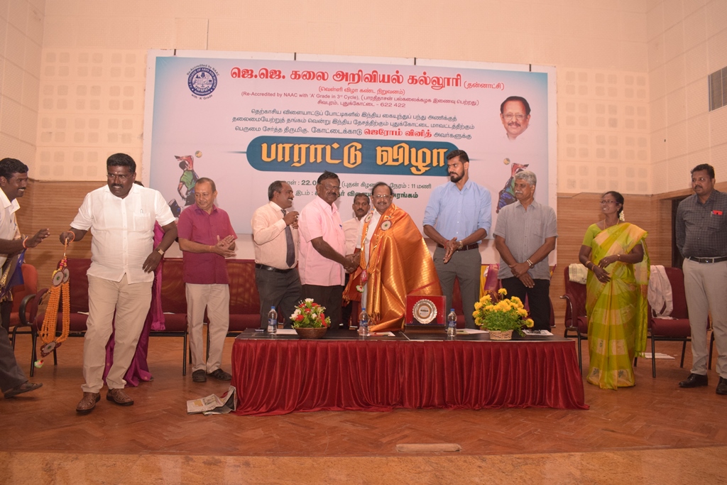 ஜெ.ஜெ. கலை அறிவியல௠கலà¯à®²à¯‚ரியில௠(தனà¯à®©à®¾à®Ÿà¯à®šà®¿) 22.01.2020 அனà¯à®±à¯ தஙà¯à®•ப௠பதகà¯à®•ம௠வெனà¯à®± சரà¯à®µà®¤à¯‡à®š கையà¯à®¨à¯à®¤à¯à®ªà¯ பநà¯à®¤à¯ வீரர௠ஜெரோம௠வினிதà¯à®¤à®¿à®±à¯à®•௠பாராடà¯à®Ÿà¯ விழா நடைபெறà¯à®±à®¤à¯. விழாவிறà¯à®•à¯à®•௠கறà¯à®ªà®• விநாயகா கலà¯à®µà®¿ அறகà¯à®•டà¯à®Ÿà®³à¯ˆà®¯à®¿à®©à¯ நிறà¯à®µà®©à®°à¯ à®®à¯à®©à¯à®©à®¾à®³à¯ மதà¯à®¤à®¿à®¯, மாநில அமைசà¯à®šà®°à¯, திரà¯à®®à®¯à®®à¯ சடà¯à®Ÿà®®à®©à¯à®± உறà¯à®ªà¯à®ªà®¿à®©à®°à¯à®®à®¾à®© திரà¯à®®à®¿à®•௠ளà¯.ரகà¯à®ªà®¤à®¿ அவரà¯à®•ள௠தலைமையேறà¯à®±à¯ பேசினாரà¯. அவர௠தம௠உரையில௠மொழிபà¯à®ªà¯‹à®°à¯ தியாகியின௠கà¯à®Ÿà¯à®®à¯à®ªà®¤à¯à®¤à¯ˆà®šà¯ சேரà¯à®¨à¯à®¤ ஜெரோம௠நம௠மணà¯à®£à®¿à®©à¯ மைநà¯à®¤à®°à¯ எனà¯à®ªà®¤à®¿à®²à¯ நாம௠அனைவரà¯à®®à¯ பெரà¯à®®à¯ˆà®•௠கொளà¯à®•ிறோமà¯. கடின உழைபà¯à®ªà®¾à®³à¯à®®à¯ இடைவிடாத à®®à¯à®¯à®±à¯à®šà®¿à®¯à®¾à®³à¯à®®à¯ ஆசிய அளவில௠வெறà¯à®±à®¿à®ªà¯à®ªà¯†à®±à¯à®±à¯ நம௠மணà¯à®£à®¿à®±à¯à®•à¯à®®à¯ நம௠தேசதà¯à®¤à®¿à®±à¯à®•à¯à®®à¯ பெரà¯à®®à¯ˆ சேரà¯à®¤à¯à®¤à¯à®³à¯à®³ ஜெரோமை இதà¯à®¤à®°à¯à®£à®¤à¯à®¤à®¿à®²à¯ நான௠மனதார பாராடà¯à®Ÿà¯à®•ினà¯à®±à¯‡à®©à¯.