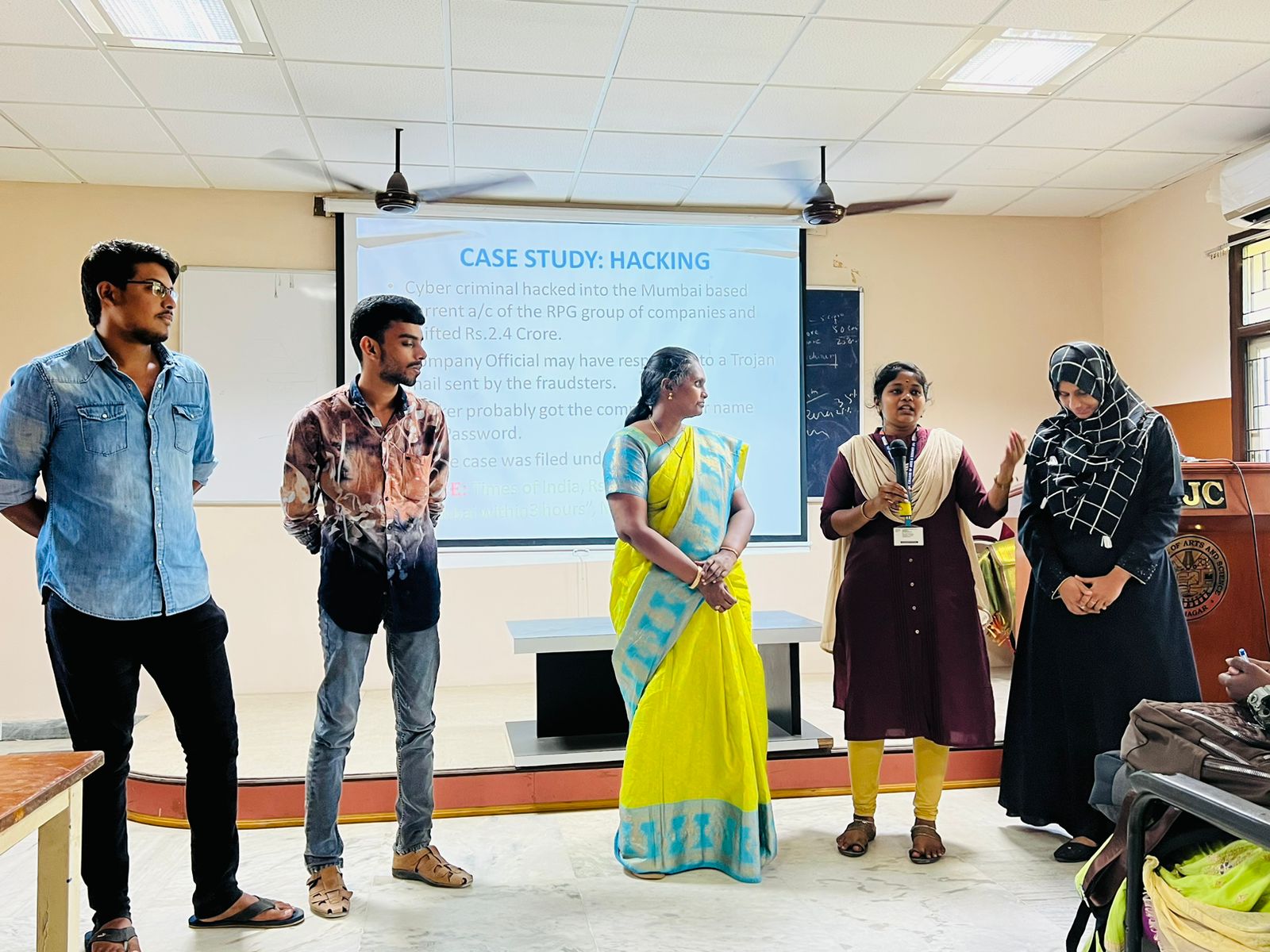 The Drucker’s Club of the PG and Research Department of Business Administration, J.J. College of Arts and Science(Autonomous), Sivapuram, Pudukkottai organized an interactive session on ‘Cyber Crime’ at 11 a.m on Friday, 16.09.2022 in the MBA Conference Hall. The Resource person Dr.B.Arthi, Department of Commerce, Urumu Dhanalakshmi College, Trichy, listed out various dimensions of cyber- crime and their impact on the normal life of individuals and societies. Cyber -crime has assumed alarming proportions due to the wide use of web based applications in trade, commerce, industry and social relations. Networks had become unmanageably wide and as a result invasion through viruses, hacking, pilfering and distortion of data etc. had become quite common. It is up to owners and users to protect their data from hacking, phishing and other malafide attempts at destabilization, intrusion, corruption and sabotage. Cyber -crimes range from private blackmailing to open terrorism. So individuals and the body politic have to be alert, agile and well prepared with suitable tools of defence and offence. Making use of a well-designed powerpoint presentation based on case studies of cyber- crimes, the speaker stimulated the audience to chew upon the dimensions of the problem and possible solutions to it. Dr.V.Sathyarekha, Head of the Department presided over the session. LK.Lakshmanan of II MBA welcomed the audience and M.Sneha also of II MBA proposed the vote of thanks.