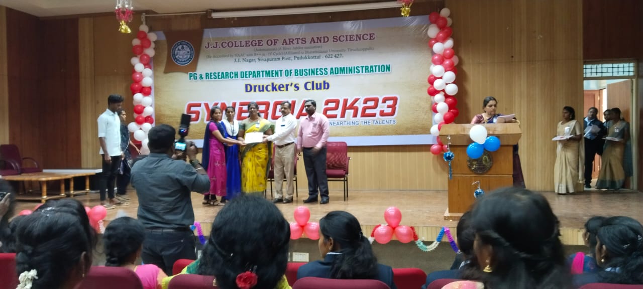 The Druckers Club of Department of Business Administration of JJ College of Arts and Science (Autonomous) Pudukkottai hosted a one day Intercollegiate Management Meet- Synergia 2K23 on Thursday, 2nd March 2023. Colleges from Sivaganga, Thanjavur and Pudukkottai districts participated. There were various events like Business quiz, Adzap, As you like it, wealth from waste, Corporate Mime and Best Manager. Sree Sevugan Annamalai College emerged the overall winners and won the shield. Winners in particular events were awarded merit certificates, cash prizes and shields.